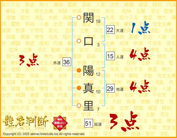 関(19画)口(3画) 陽(12画)真(10画)里(7画)