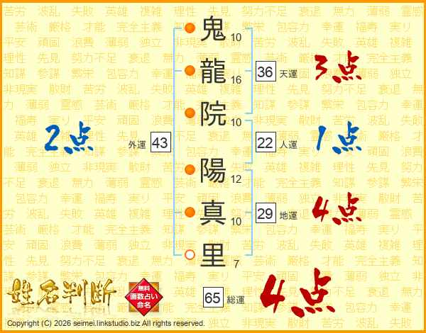 鬼(10画)龍(16画)院(10画) 陽(12画)真(10画)里(7画)