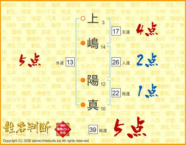 上(3画)嶋(14画) 陽(12画)真(10画)