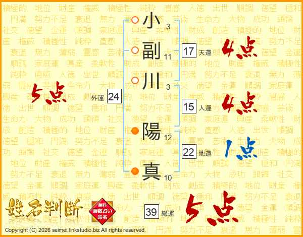 小副川陽真さんの総運は39画の5点!