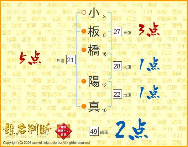 小(3画)板(8画)橋(16画) 陽(12画)真(10画)