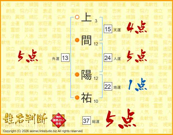 生活面を象徴する運勢です。外部から受ける影響力を表し、結婚運、家庭運や職場、環境への順応性を表します。総運から人運を引いた画数。姓や名が1文字の場合を除く。