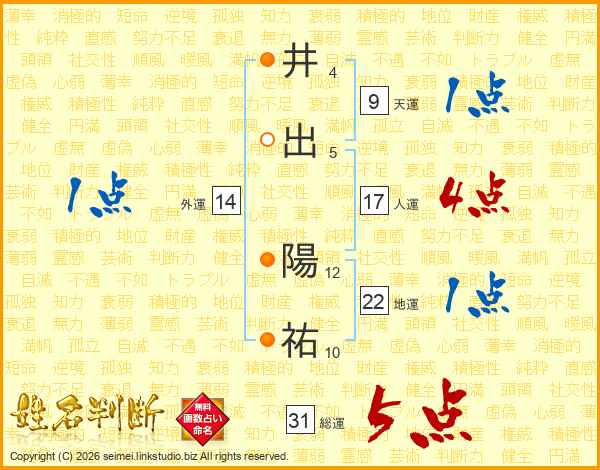 井(4画)出(5画) 陽(12画)祐(10画)