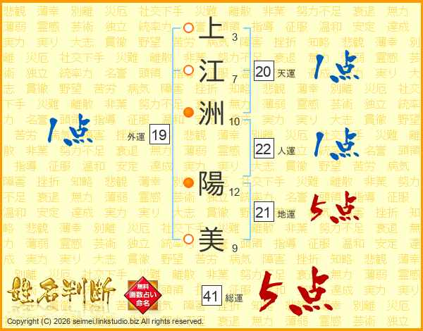 画数の奇数(○陽)と偶数(●陰)の配列で吉凶を占います。どちらかにかたよる名前は大凶名で避ける必要があります。画数の奇数偶数。