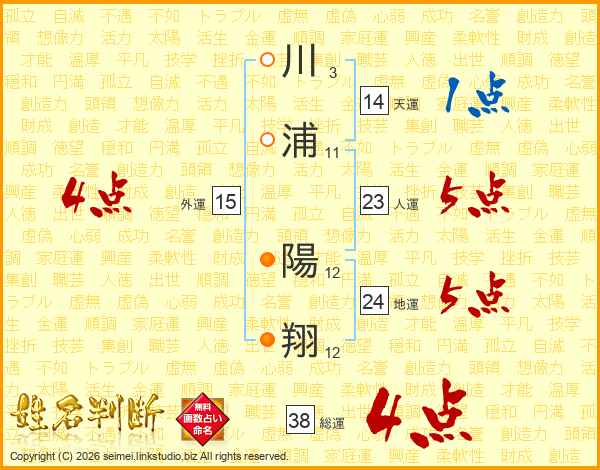 川(3画)浦(11画) 陽(12画)翔(12画)