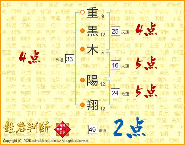 重(9画)黒(12画)木(4画) 陽(12画)翔(12画)