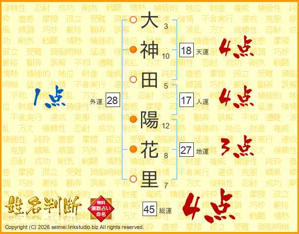 大(3画)神(10画)田(5画) 陽(12画)花(8画)里(7画)