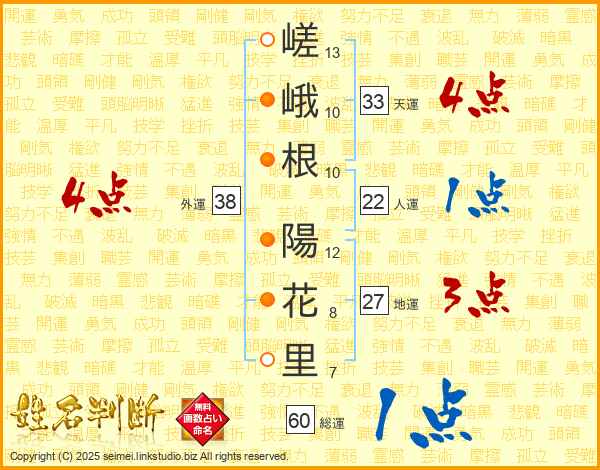 嵯(13画)峨(10画)根(10画) 陽(12画)花(8画)里(7画)