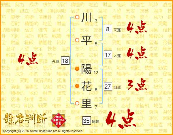 川(3画)平(5画) 陽(12画)花(8画)里(7画)