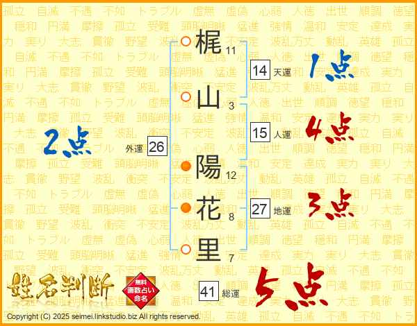 梶(11画)山(3画) 陽(12画)花(8画)里(7画)
