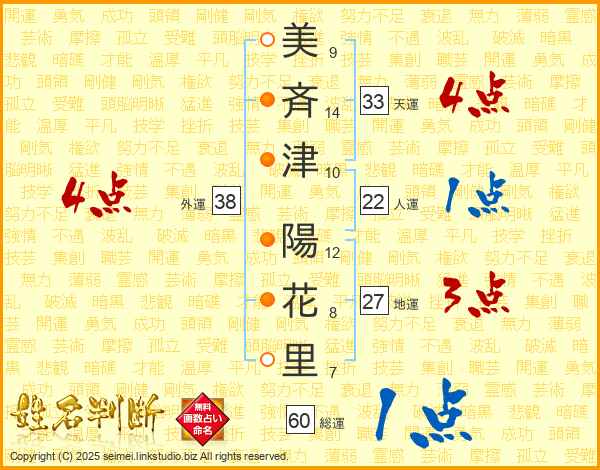 美(9画)斉(14画)津(10画) 陽(12画)花(8画)里(7画)