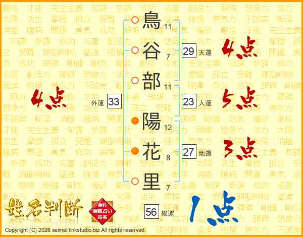 鳥(11画)谷(7画)部(11画) 陽(12画)花(8画)里(7画)