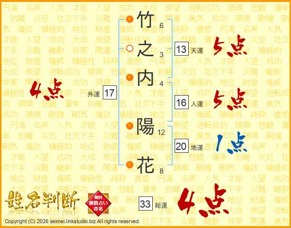 生活面を象徴する運勢です。外部から受ける影響力を表し、結婚運、家庭運や職場、環境への順応性を表します。総運から人運を引いた画数。姓や名が1文字の場合を除く。