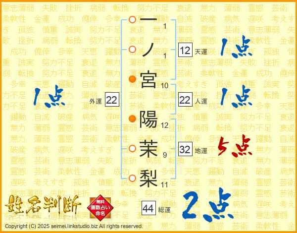 一ノ宮陽茉梨さんの総運は44画の2点!