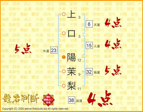 上(3画)口(3画) 陽(12画)茉(9画)梨(11画)