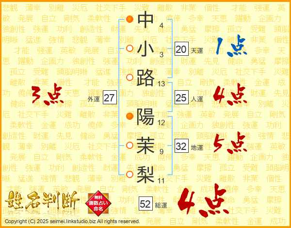 中(4画)小(3画)路(13画) 陽(12画)茉(9画)梨(11画)