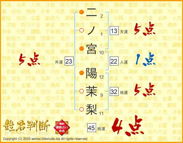 二ノ宮陽茉梨さんの総運は45画の4点!