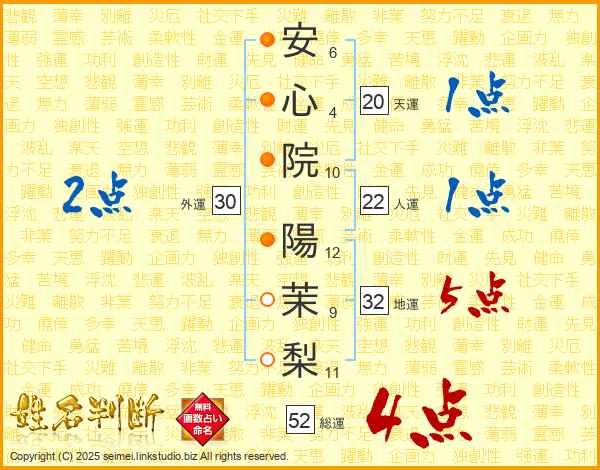 安(6画)心(4画)院(10画) 陽(12画)茉(9画)梨(11画)