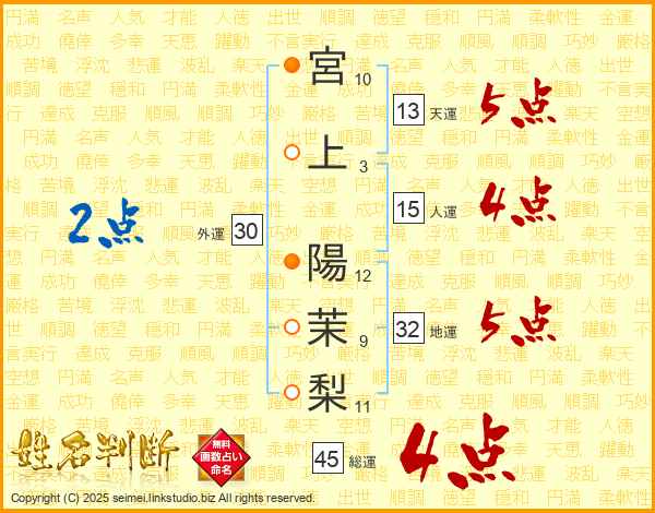 宮(10画)上(3画) 陽(12画)茉(9画)梨(11画)