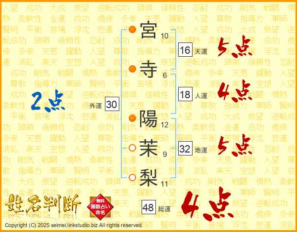 宮(10画)寺(6画) 陽(12画)茉(9画)梨(11画)