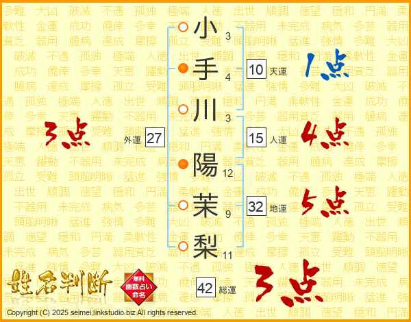 小手川陽茉梨さんの総運は42画の3点!