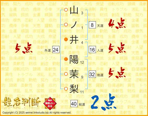 山(3画)ノ(1画)井(4画) 陽(12画)茉(9画)梨(11画)
