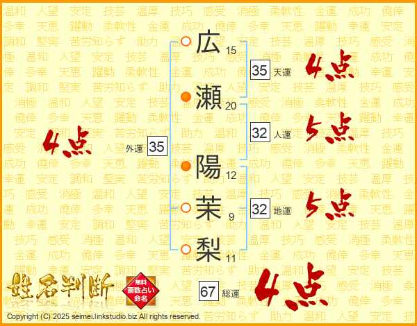広(15画)瀬(20画) 陽(12画)茉(9画)梨(11画)