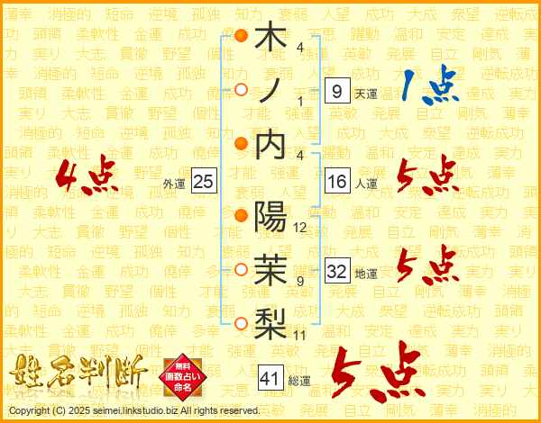 木(4画)ノ(1画)内(4画) 陽(12画)茉(9画)梨(11画)