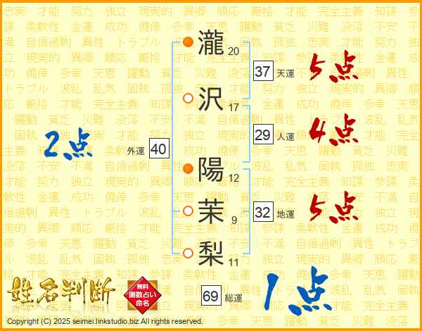 瀧(20画)沢(17画) 陽(12画)茉(9画)梨(11画)