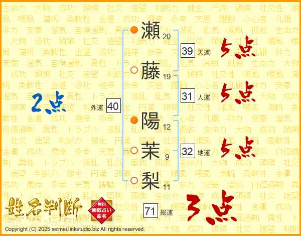 瀬(20画)藤(19画) 陽(12画)茉(9画)梨(11画)