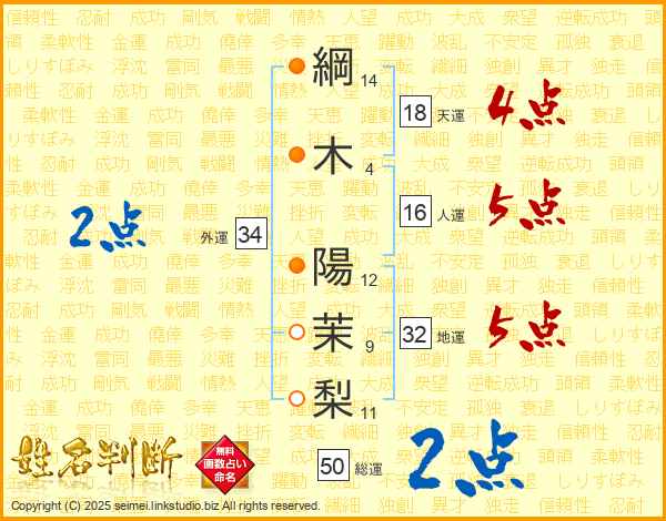 綱(14画)木(4画) 陽(12画)茉(9画)梨(11画)