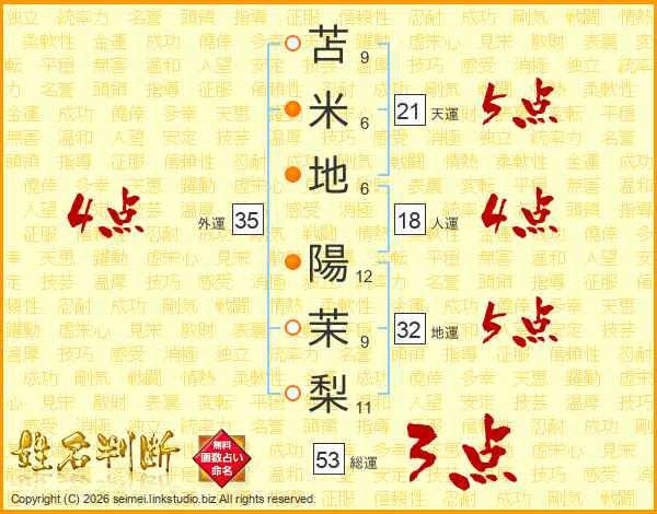 苫(9画)米(6画)地(6画) 陽(12画)茉(9画)梨(11画)