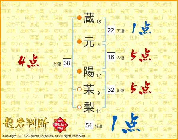 蔵(18画)元(4画) 陽(12画)茉(9画)梨(11画)