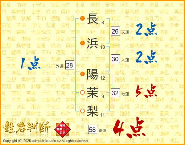 長(8画)浜(18画) 陽(12画)茉(9画)梨(11画)