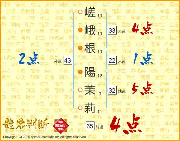 嵯峨根陽茉莉さんの総運は65画の4点!