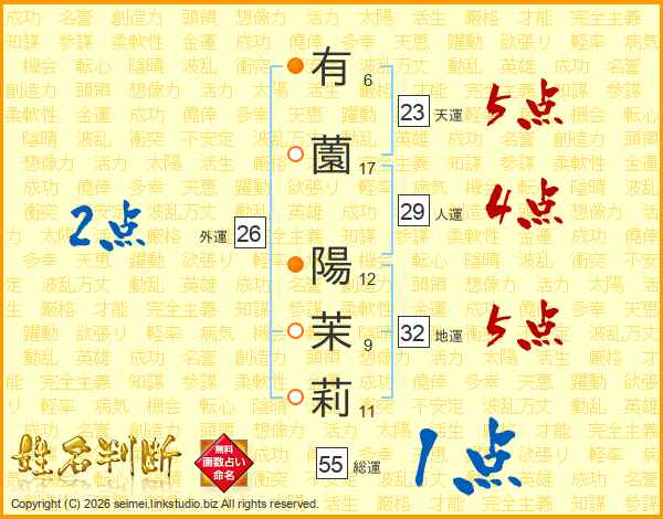 有(6画)薗(17画) 陽(12画)茉(9画)莉(11画)