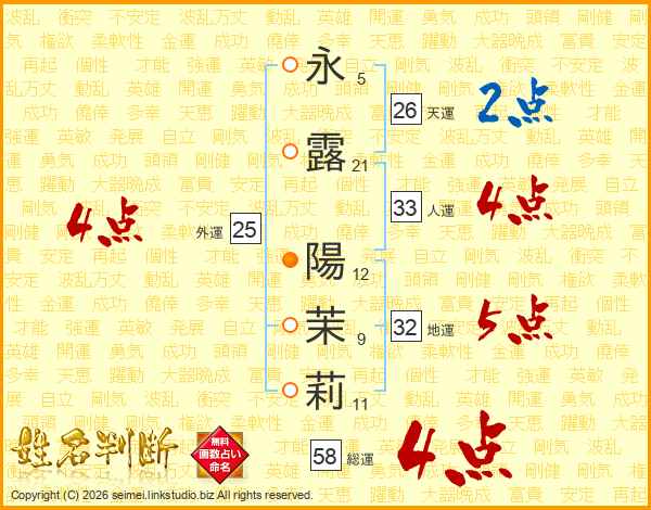 永(5画)露(21画) 陽(12画)茉(9画)莉(11画)
