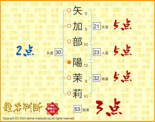 矢(5画)加(5画)部(11画) 陽(12画)茉(9画)莉(11画)
