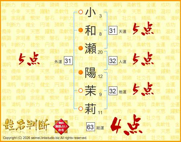 小(3画)和(8画)瀬(20画) 陽(12画)茉(9画)莉(11画)