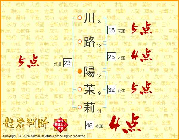 川(3画)路(13画) 陽(12画)茉(9画)莉(11画)