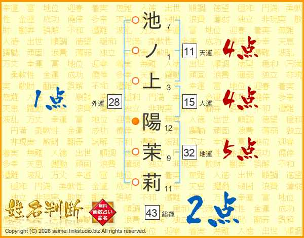 池(7画)ノ(1画)上(3画) 陽(12画)茉(9画)莉(11画)