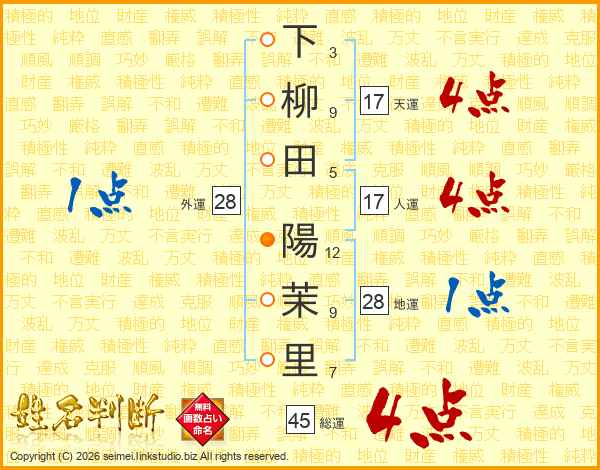 下(3画)柳(9画)田(5画) 陽(12画)茉(9画)里(7画)