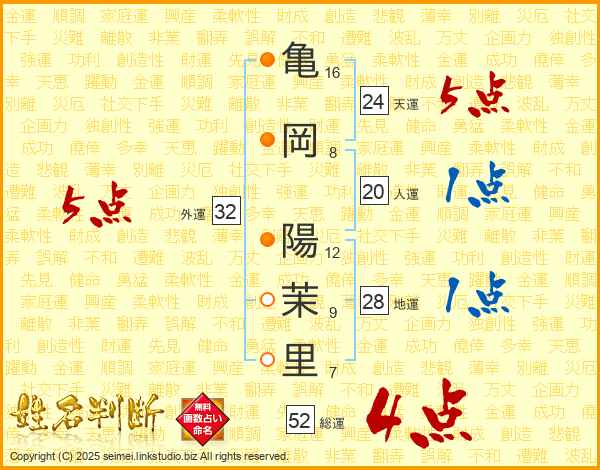 亀(16画)岡(8画) 陽(12画)茉(9画)里(7画)