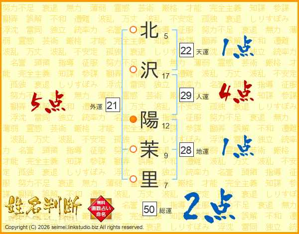 北(5画)沢(17画) 陽(12画)茉(9画)里(7画)