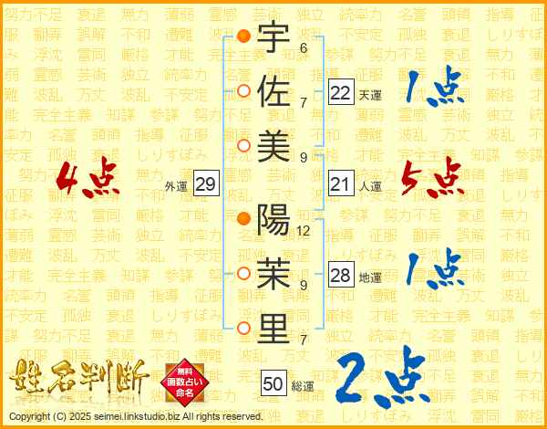 宇(6画)佐(7画)美(9画) 陽(12画)茉(9画)里(7画)