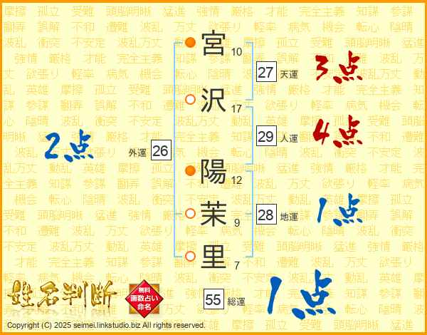 宮(10画)沢(17画) 陽(12画)茉(9画)里(7画)