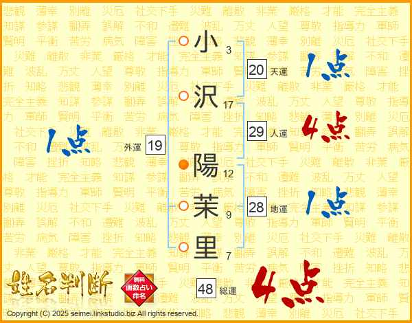 小(3画)沢(17画) 陽(12画)茉(9画)里(7画)