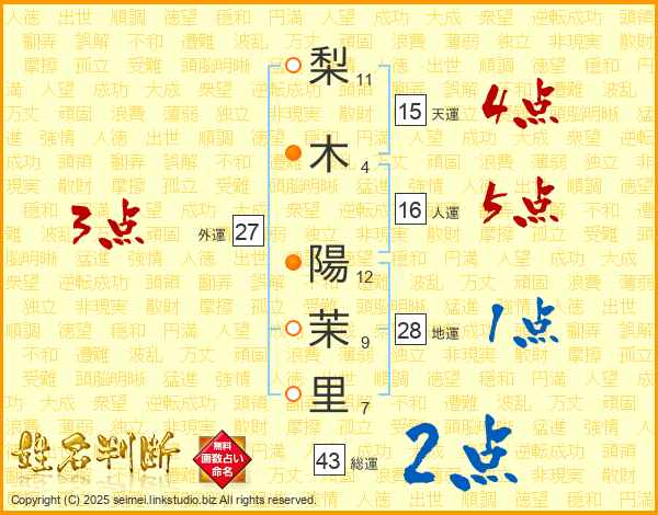 梨(11画)木(4画) 陽(12画)茉(9画)里(7画)