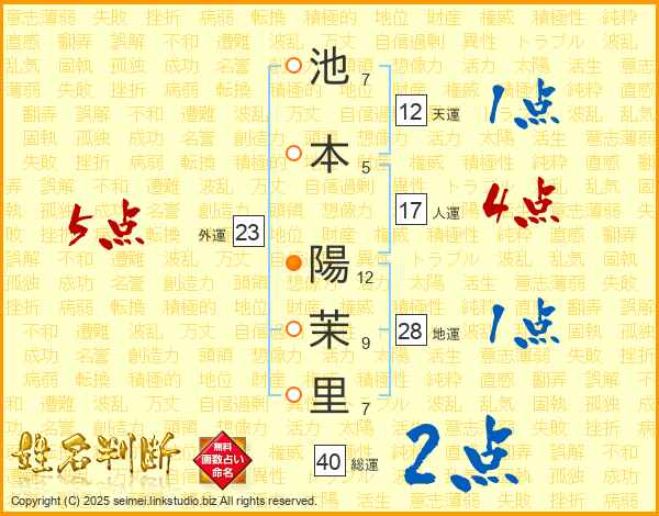 池(7画)本(5画) 陽(12画)茉(9画)里(7画)