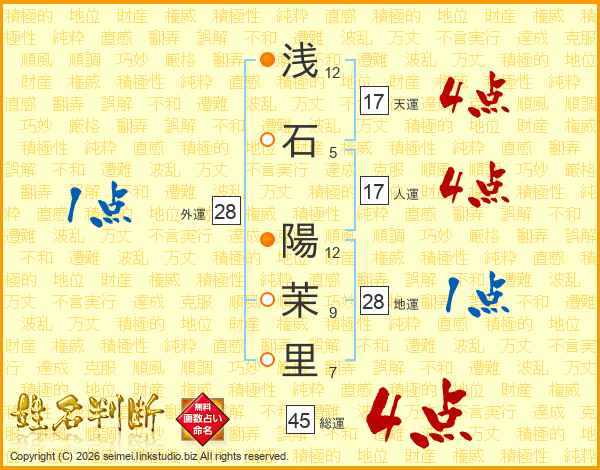 浅(12画)石(5画) 陽(12画)茉(9画)里(7画)